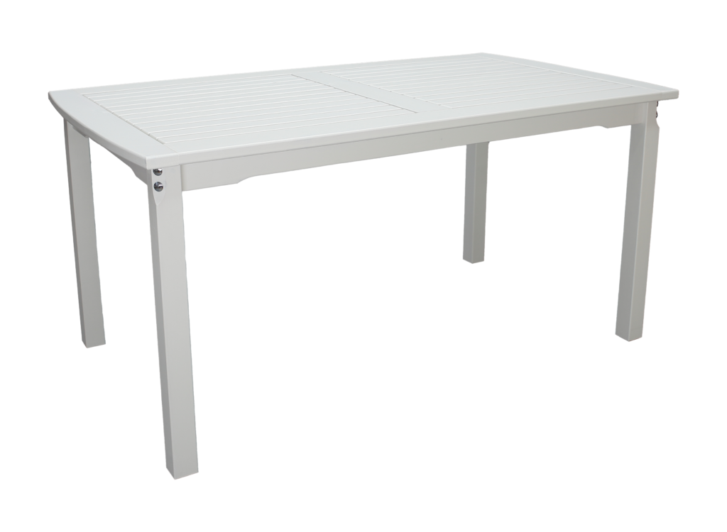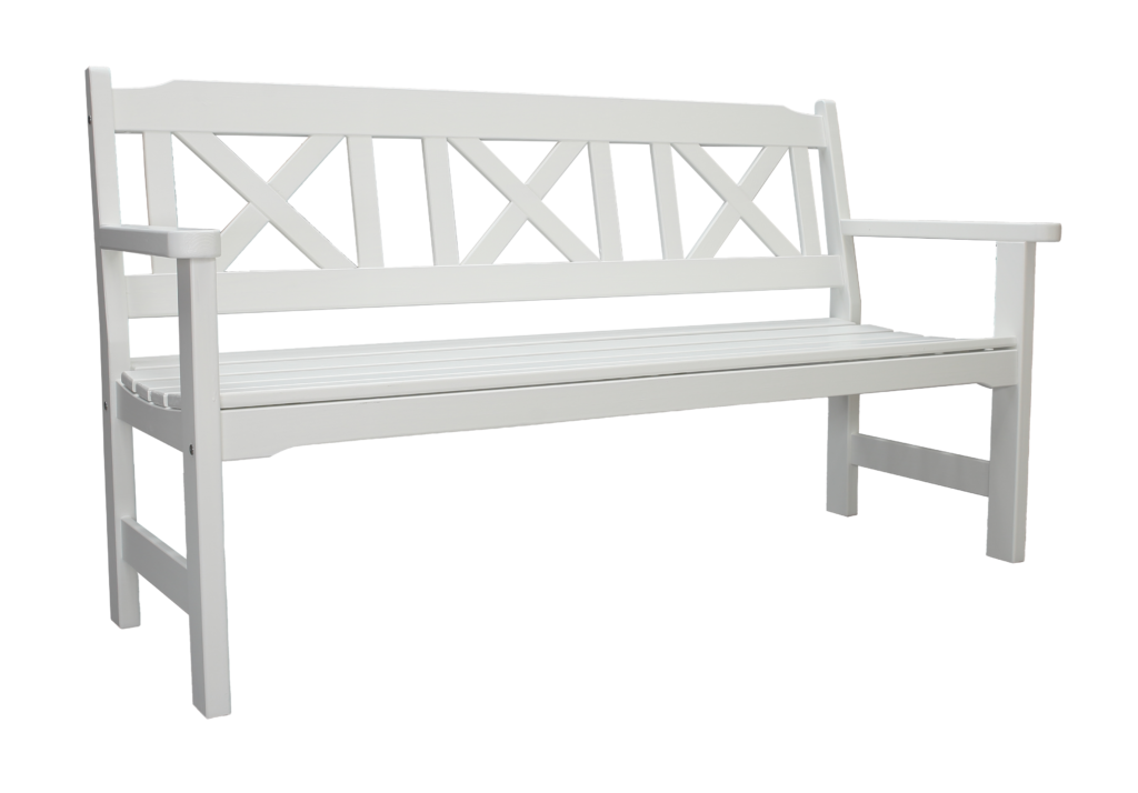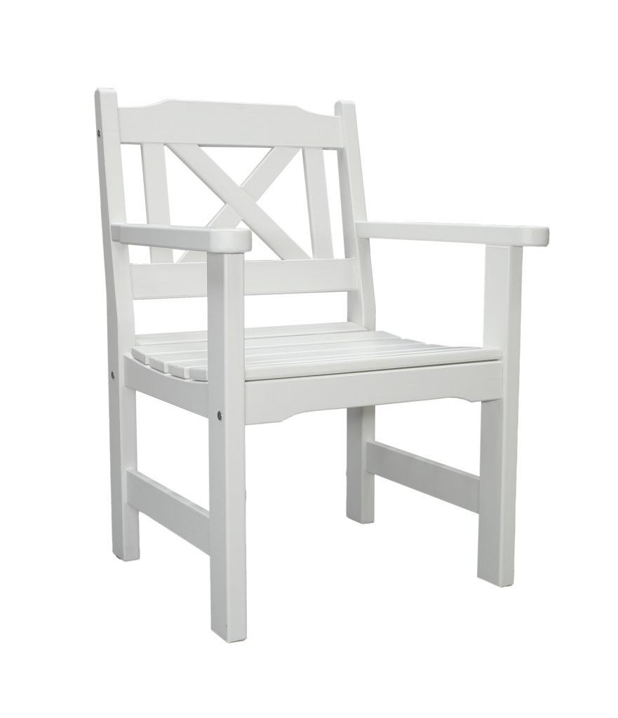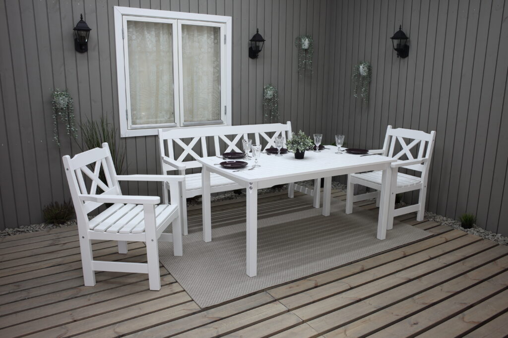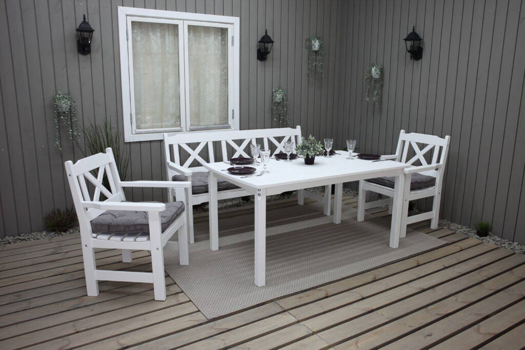 A white colored massive garden furniture group with a classically expressive design. Works great as a dining group or as a simple eye-candy in the garden. Made of strong and solid wood.