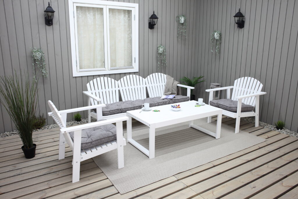 A white-glazed massive garden furniture lounge group with a classic design. Works great as a dining-coffee group or just furniture for relaxing. Made of pine-wood.