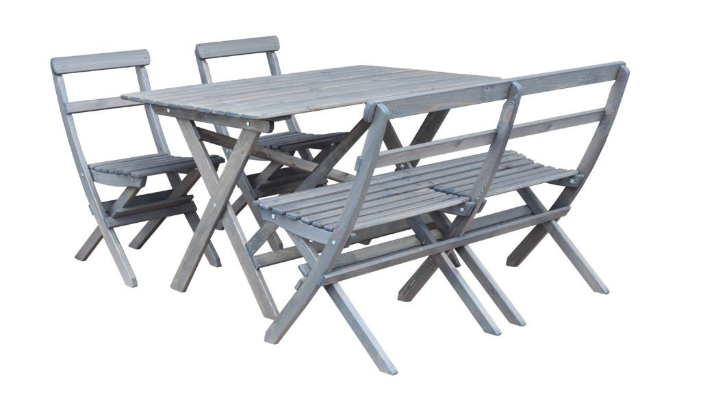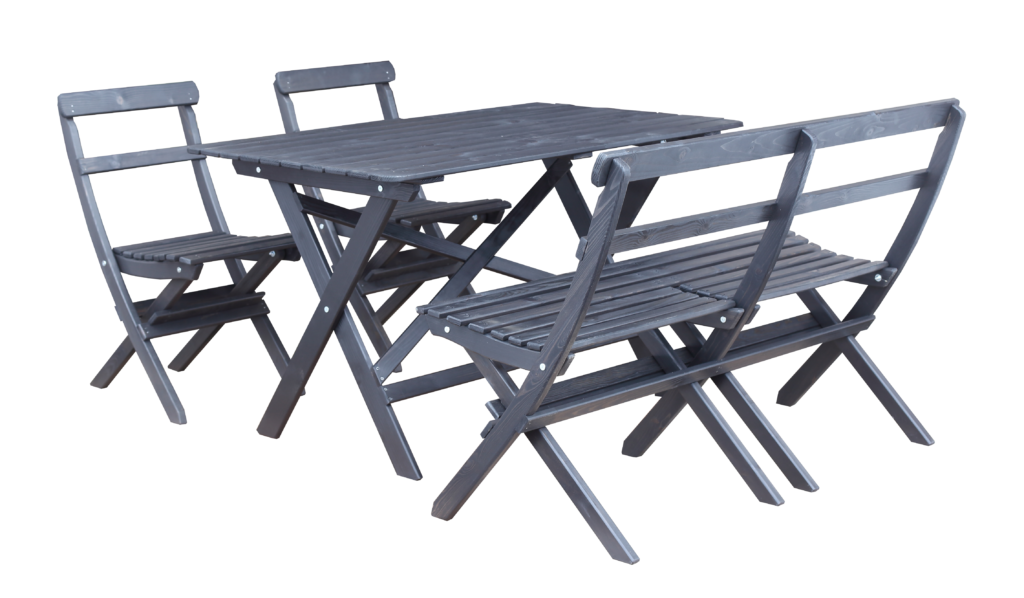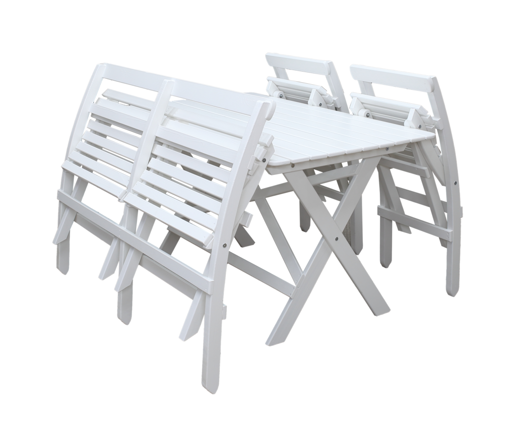 A white-glazed, ashgrey or black colored partly foldable (chairs and sofas) garden furniture group with a light design. Works great as a dining group or as a useful accessory in the garden. Made of pine-wood.