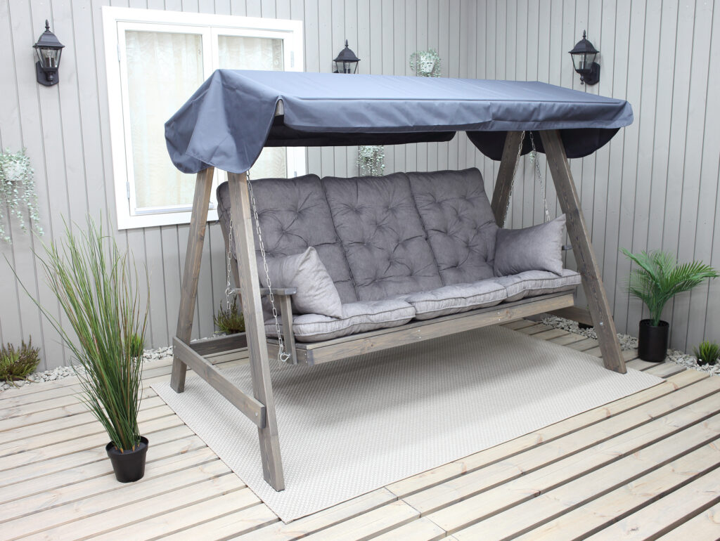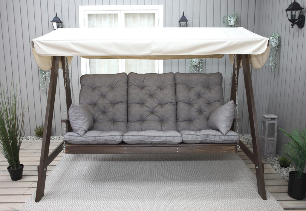Strong and comfortable garden swing in 4 colors (brown, grey, white and black) and different roof-color (beige, grey, blue, black) options. Made of pine-wood. Good for lazy days …