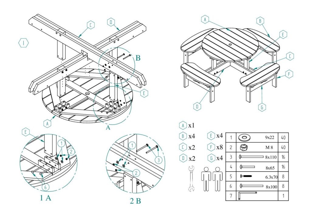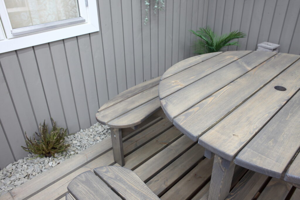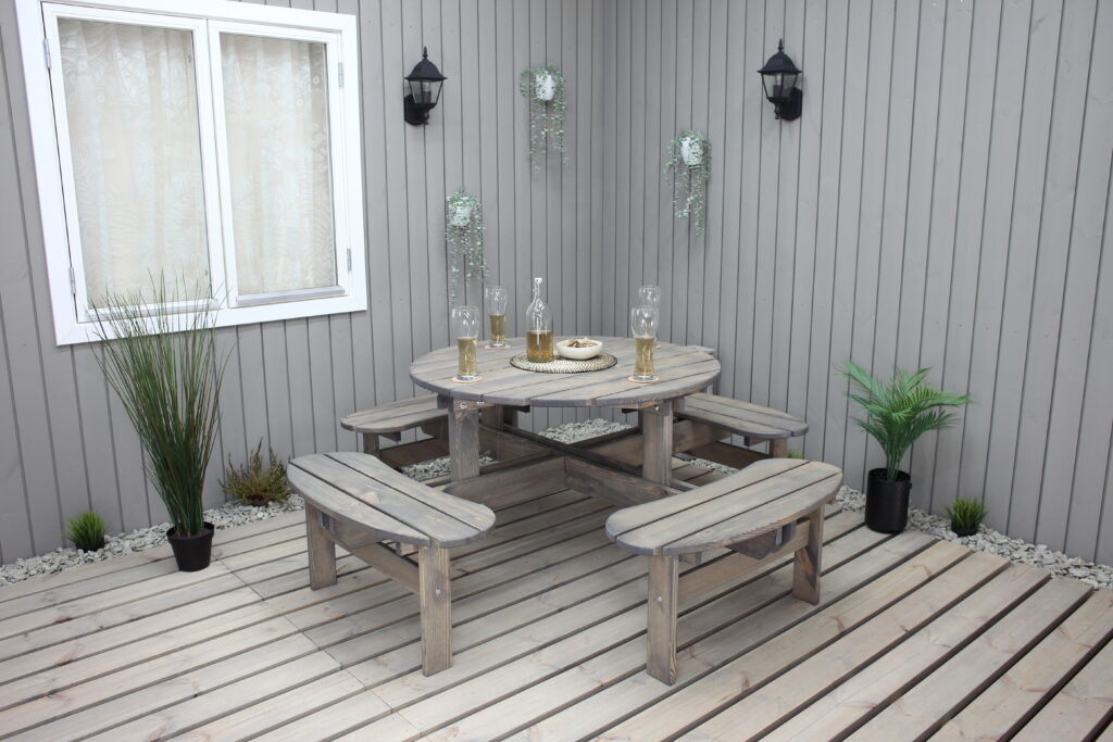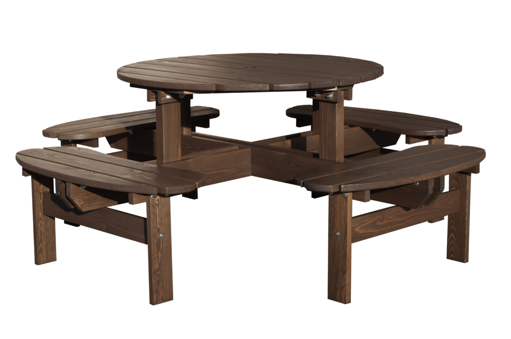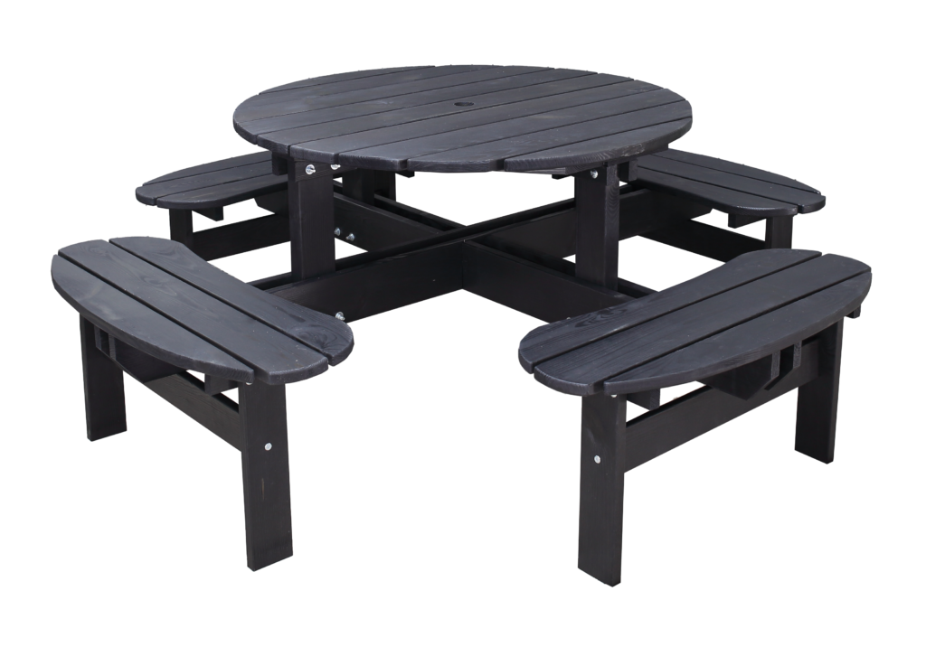 A strong stabil massive wood picnic bench for 6-8 persons with nice round design. Available in 3 colors – brown, grey and black.