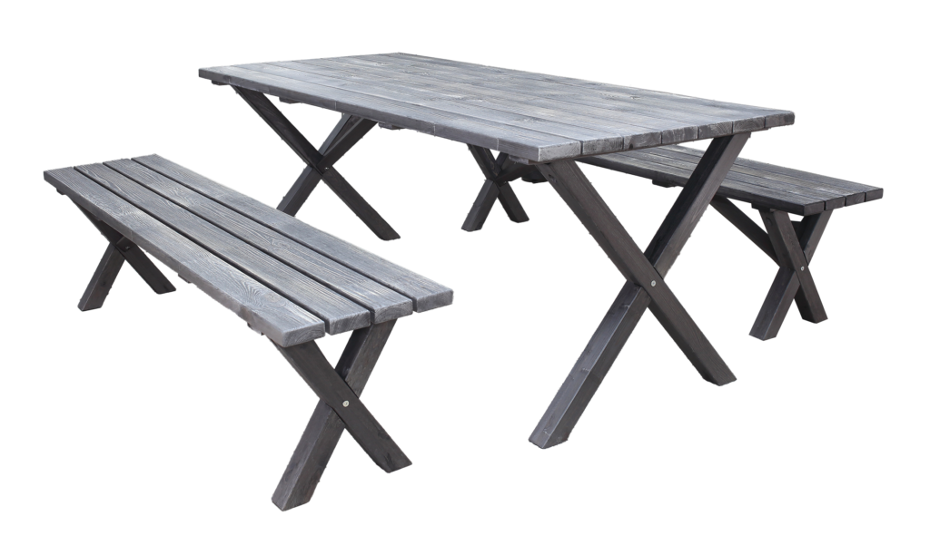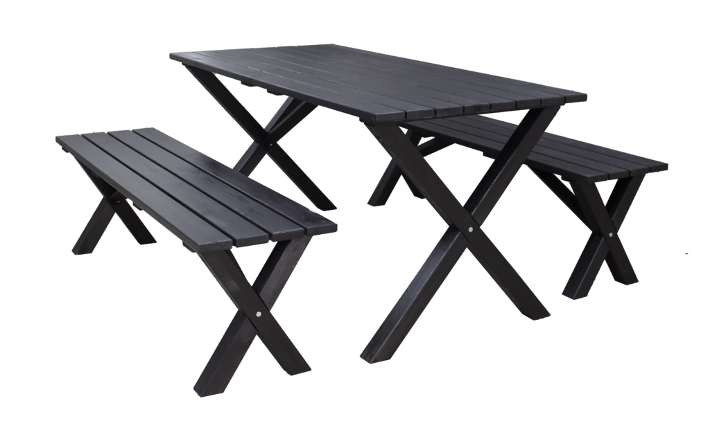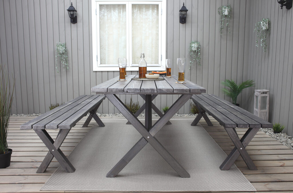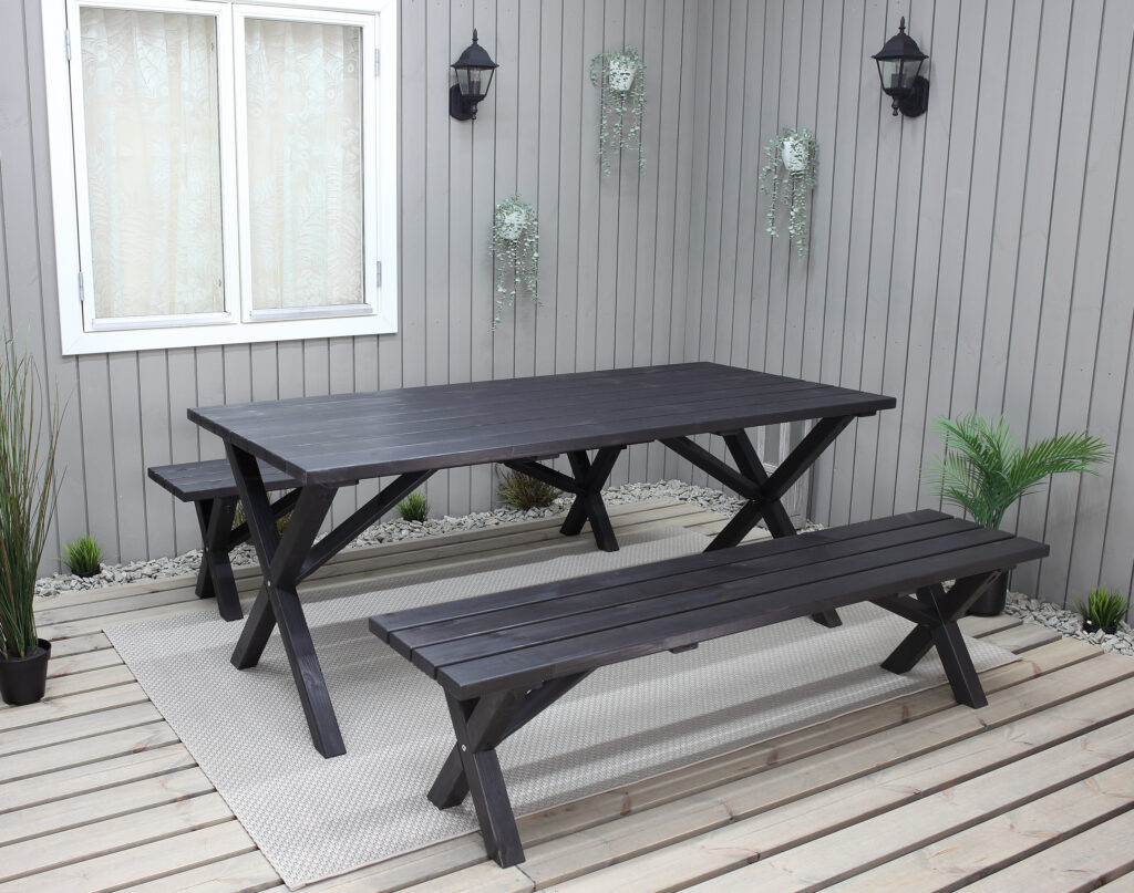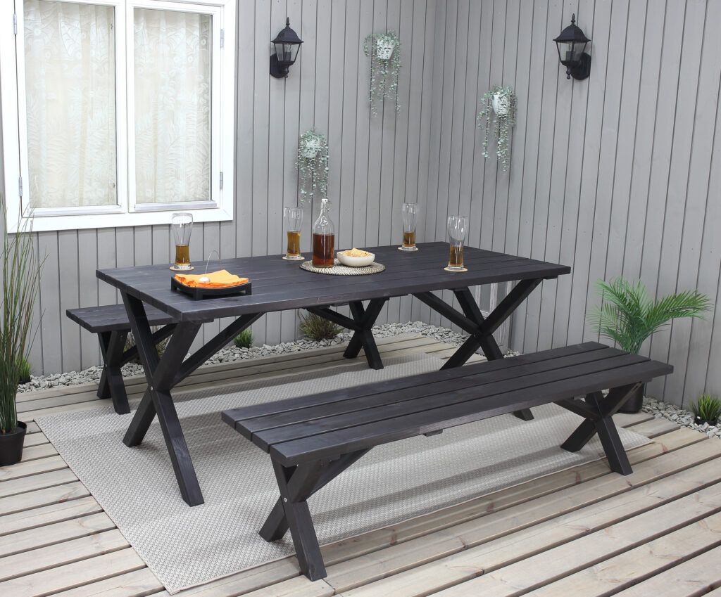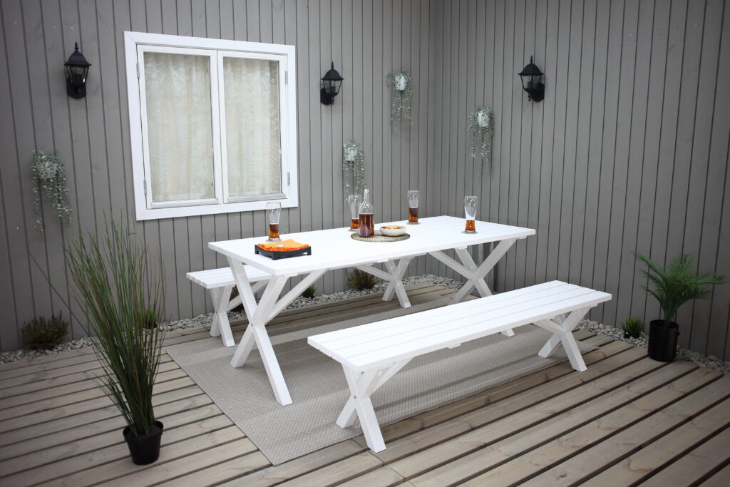 Practical garden furniture group with 190 cm table and 2 x 180 cm benches. Works great as a dining group for 6-8 people. Available in white, grey or black color. Items can be bought also separately.