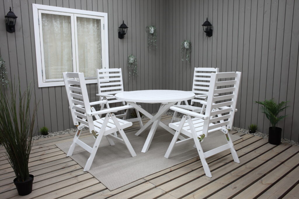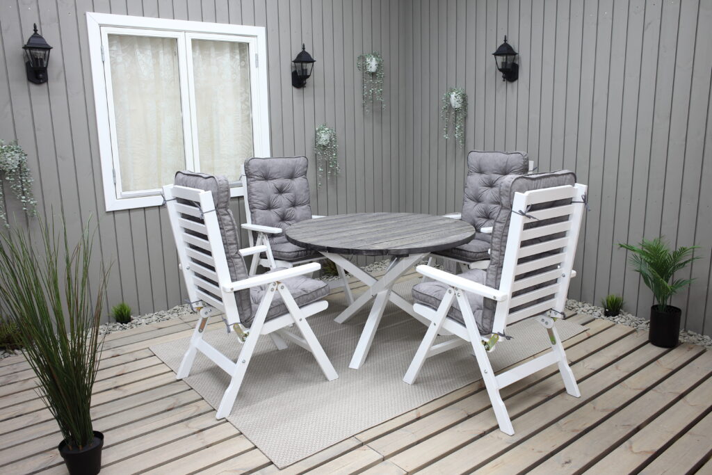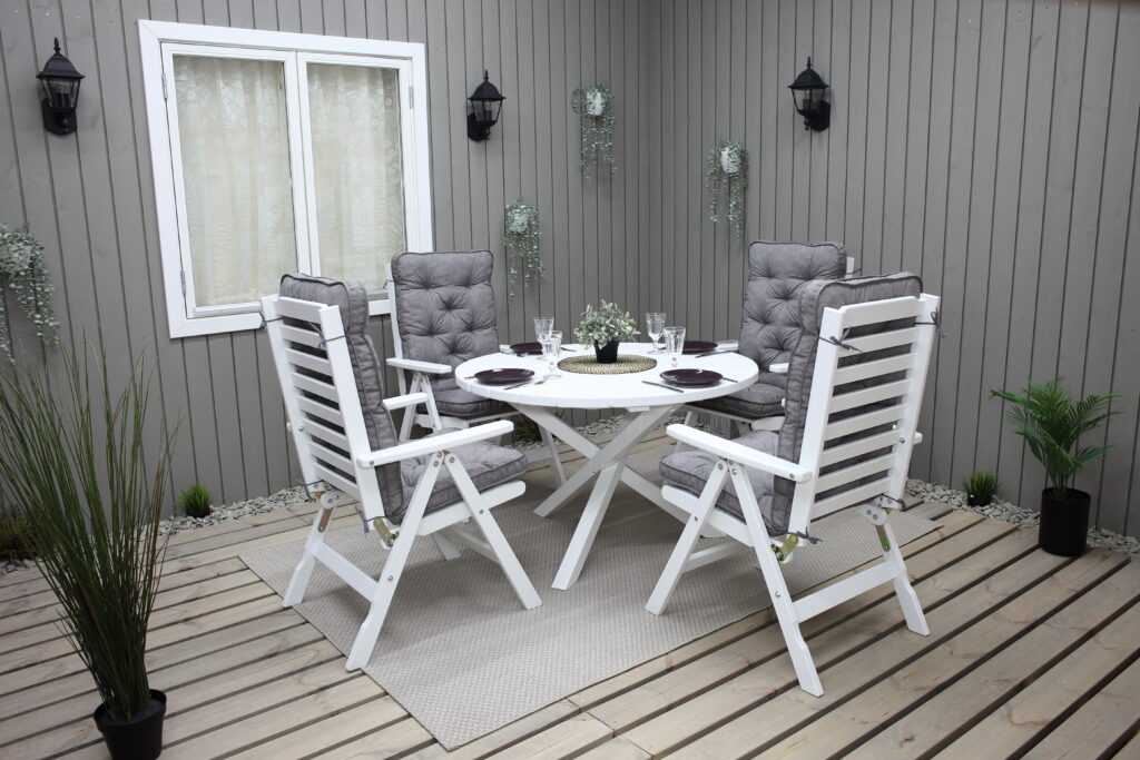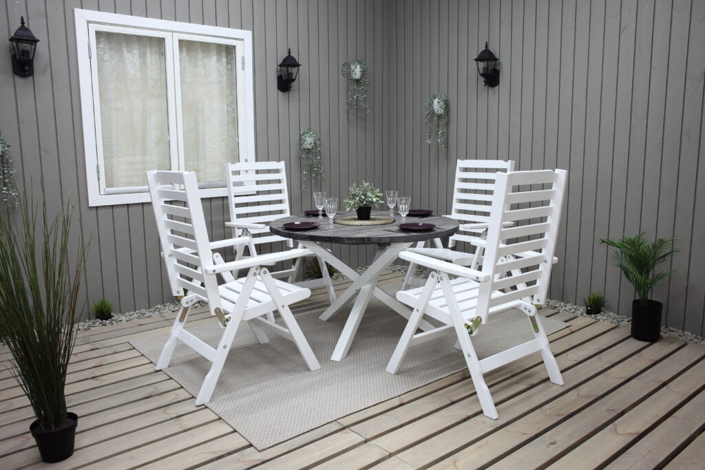 Practical and elegant garden furniture group with round Ø112 cm table and 4 Båstad position chairs. Works great as a dining group for 4 people. Items can be bought also separately.
