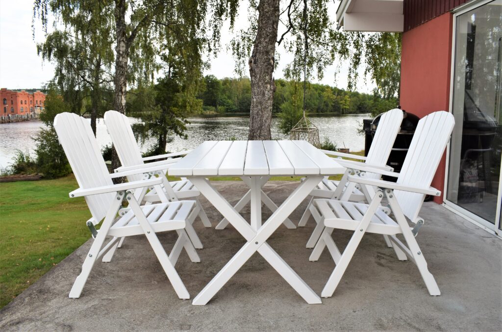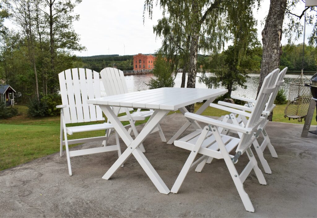 Practical and elegant garden furniture group with 150 cm table and 4 Kungshamn position chairs. Works great as a dining group for 4 people. Items can be bought also separately.
