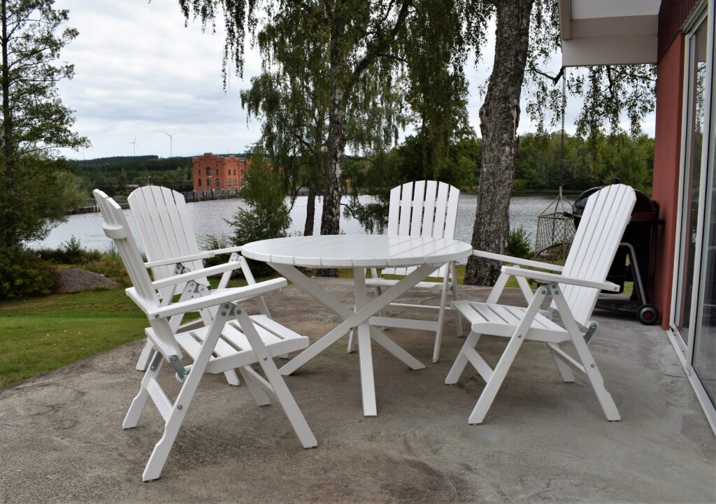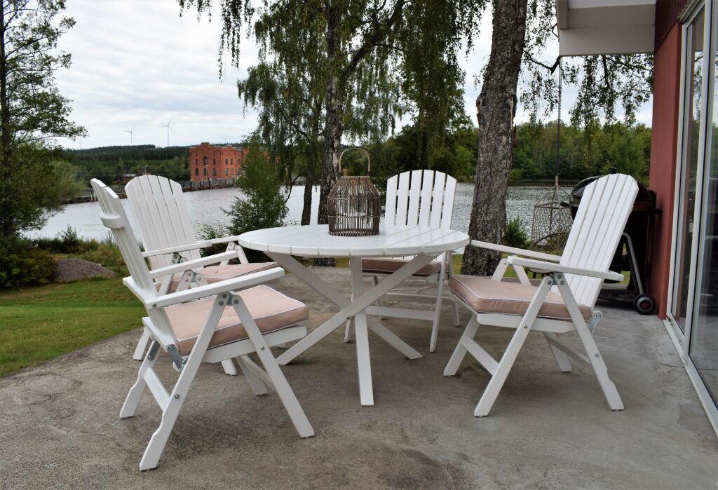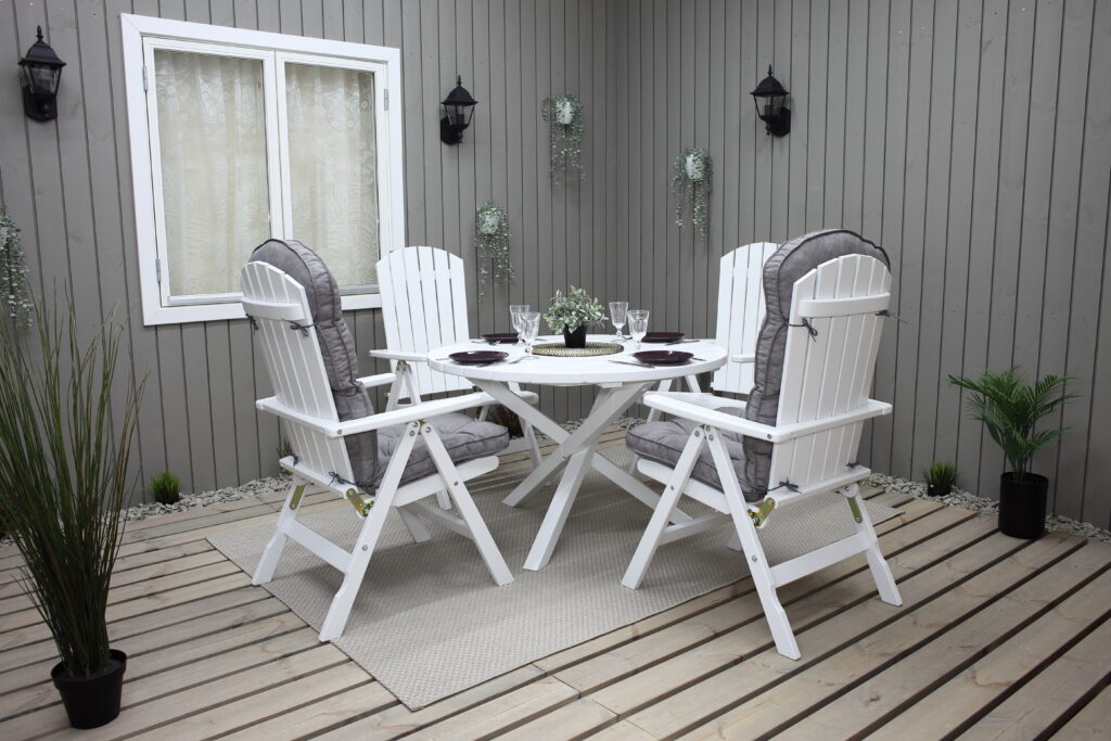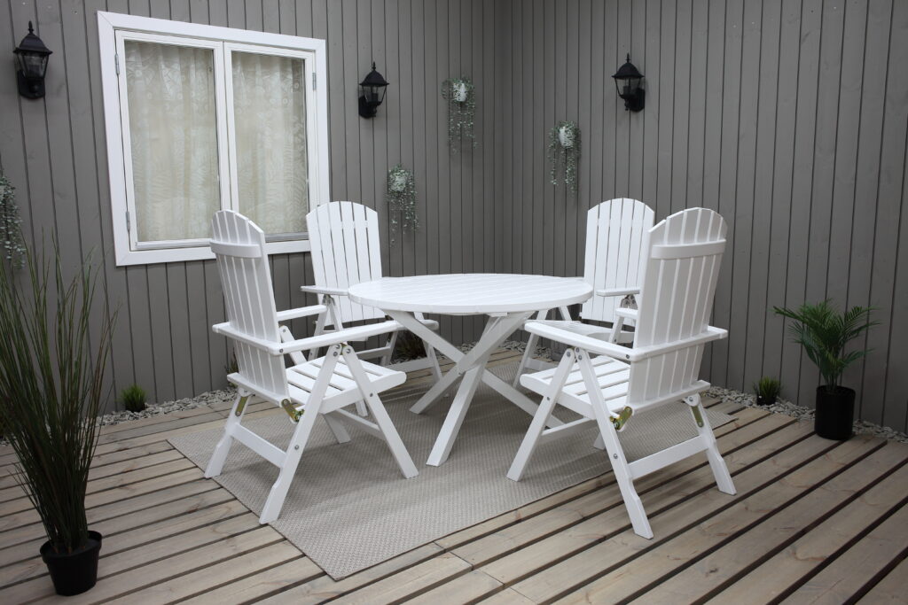 Practical and elegant garden furniture group with round Ø112 cm table and 4 Kungshamn position chairs. Works great as a dining group for 4 people. Items can be bought also separately.